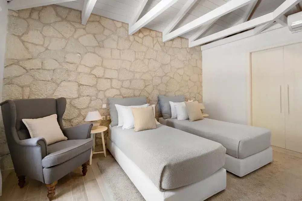 Twin bedroom — en-suite shower; opens to pool terrace and sea view.